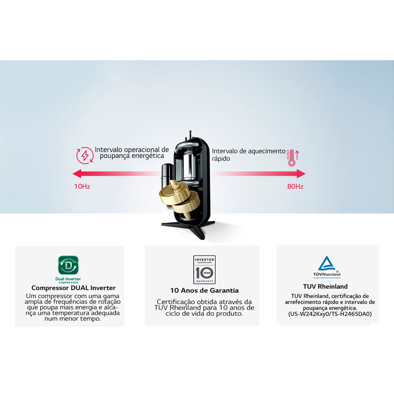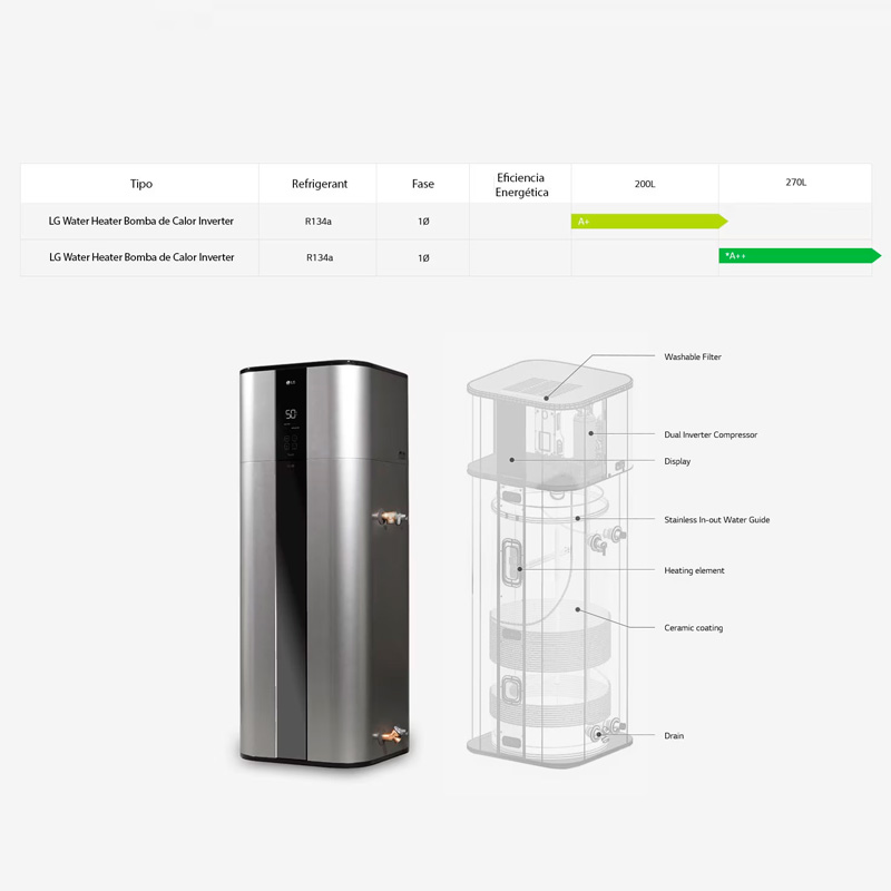 | Mais Informação: | WIFI: Control Wi-Fi com LG ThinQ™; Eficiência energética: A+; Capacidade: 200 litros; Dimensões (LxAxP) 580x1625x582mm; Compressor: Dual Inverter; Gás: R134a; Filtro lavável; Display; Revestimento cerâmico; Esgoto; |