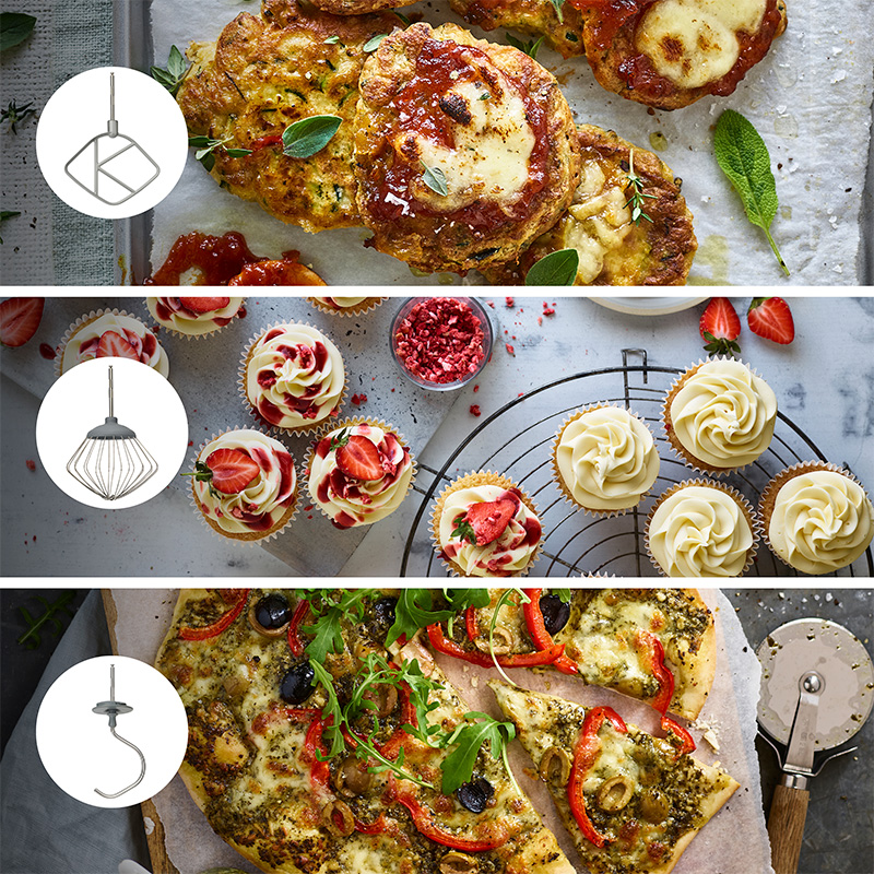 Mais Informação: Potencia 1000 W Capacidade (litros) 4,3 Litros Funções Misturar, Bater, Amassar e envolver Velocidades 6 Acessórios 3 Batedores Liquidificador de vidro (1,2L) Processador de alimentos (1,4L) 3 Discos de Corte Espremedor de Citrinos Controlo de velocidade inteligente Bloqueio de segurança. Dimensões: 35 x 38,5 x 48 cm Peso (Kg) 11,9 Kg