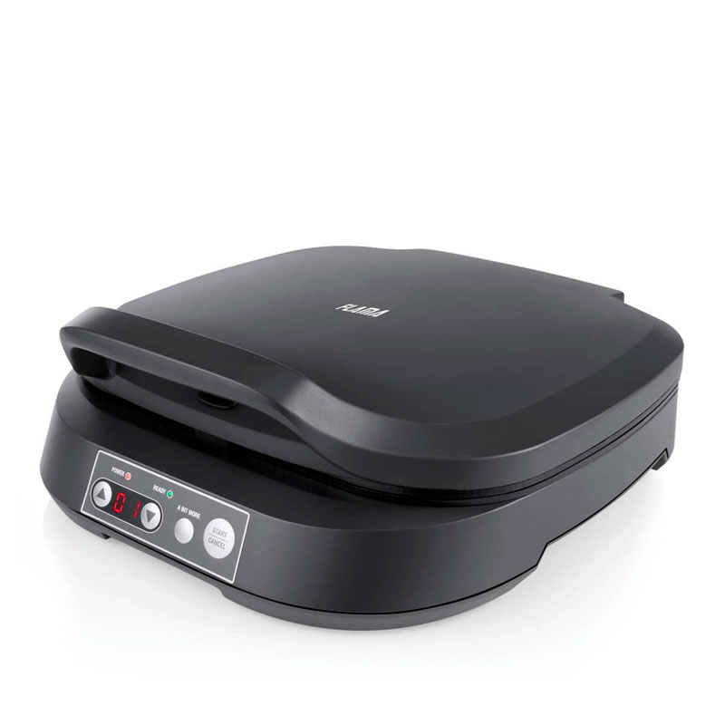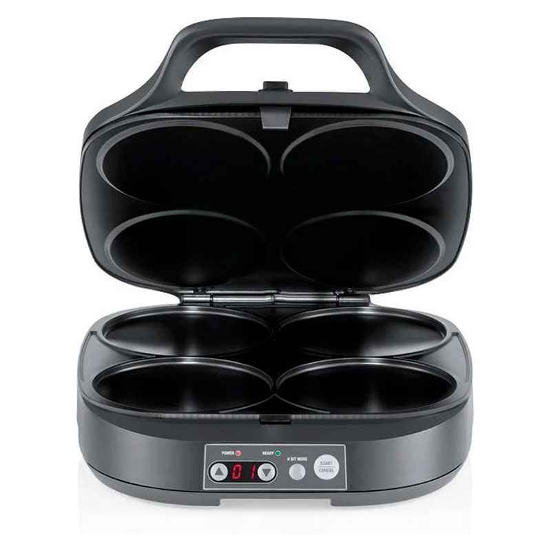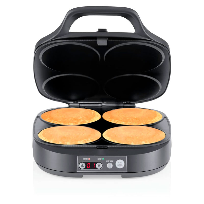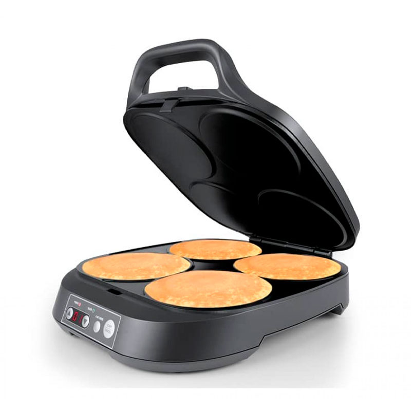 A máquina de panquecas e snacks 4906FL tem uma potência máxima de 2000 W, temporizador, 4 concavidades para panquecas ou snacks e placas fixas antiaderentes.